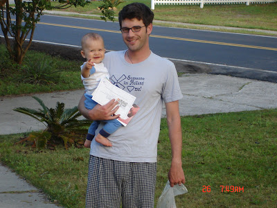 Here is our new baby-friend Gabe on his first trip to the beach! For all you domers, this is professor Amy Barrett's newest nephew. He was a champ at the beach... which means he slept the whole time and let mom and dad relax. Sean loves babies and when he noticed Gabe in the seat he tried to get at him over and over until we distracted him with more sand and another banana.