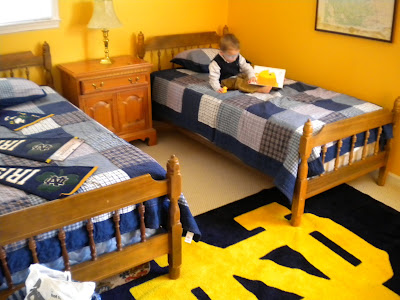 Here is the (almost) finished product! Can you guess the theme? We have a few more things to hang on the walls (i.e., the penants on the left bed and an N.D. poster), but I think it looks pretty good so far.